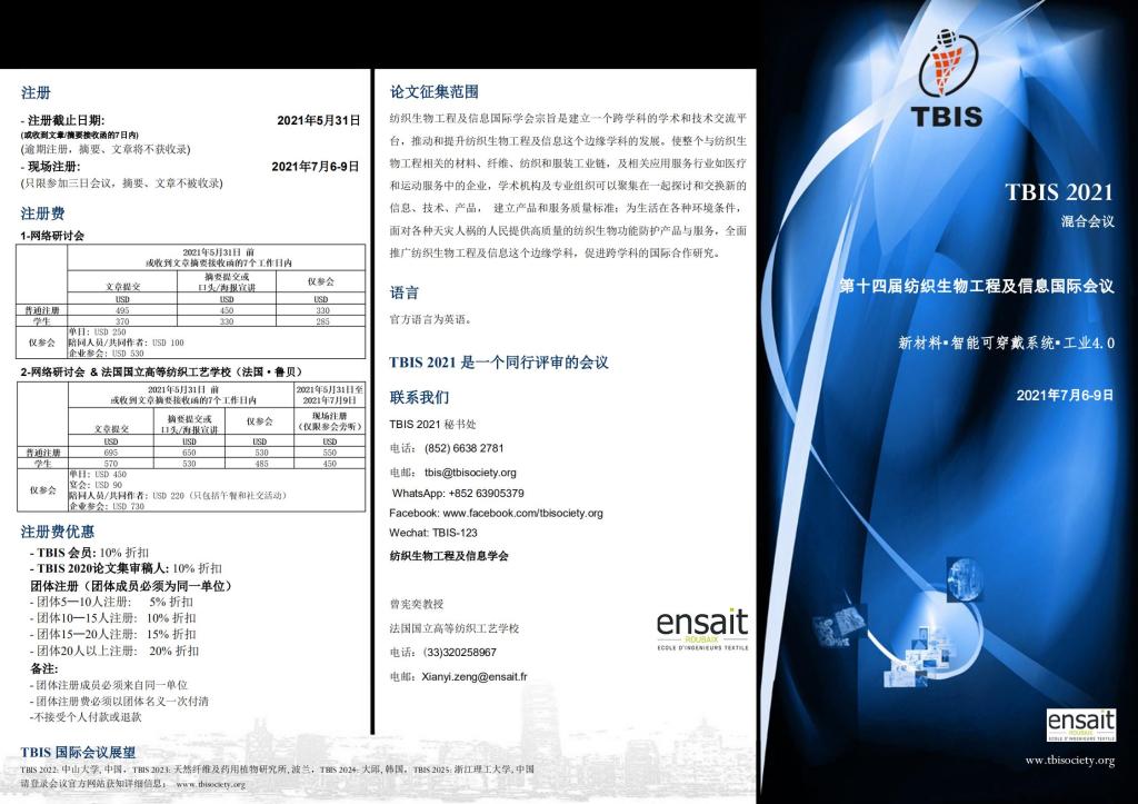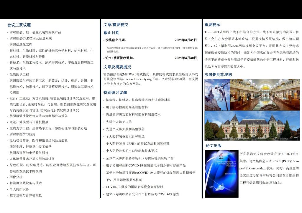 学术会议 当前位置: 首页 > 学术会议 > 正文 TBIS 2021:第十四届纺织生物工程及信息国际会议 作者:时间:2020-11-19浏览次数: 附件【01-c-TBIS Brochure2021.pdf】已下载次 附件【01-Call for papers-abstracts-TBIS2021.pdf】已下载次 附件【01-e-English-TBIS Brochure2021.pdf】已下载次