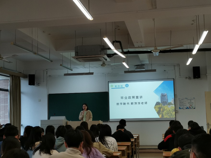 此外,学院研究生教学秘书解萍萍老师向同学们介绍了学院毕业生学位论文工作的具体要求,为毕业生们梳理学位论文管理的重要时间节点、并整理关键信息。