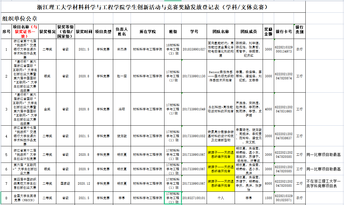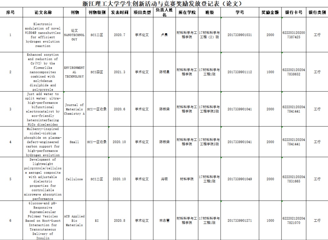 为进一步加强学院学风建设,激发广大学生参加创新活动与竞赛及出国交流学习的主动性和积极性,提高学生的创新能力,根据《糖心vlog 学风促进实施办法》(材料学〔2020〕3号),在学院本科生范围内进行申报糖心vlog 学生创新活动与竞赛奖励。经过前期个人申报、学院初审,现将学生申报结果公示如下: