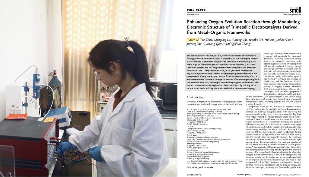 近日,我校材料科学与工程学院2016级本科生李宇文在导师高俊阔教授、姚菊明教授的指导下,与新加坡南洋理工大学张其春教授合作,在国际权威期刊《Small》(SCI一区,IF:10.856,TOP期刊,材料工程领域TOP 1%)上以第一作者发表论文一篇(Enhancing Oxygen Evolution Reaction Through Modulating Electronic Structure of Trimetallic Electrocatalysts Derived From Metal-Organic Framework),该论文是本校本专业历年来本科生发表影响因子最高的论文,团队核心成员均为本科生。《Small》是德国Wiley出版社旗下顶级期刊,属于中科院工程一区,当前影响因子为10.856。