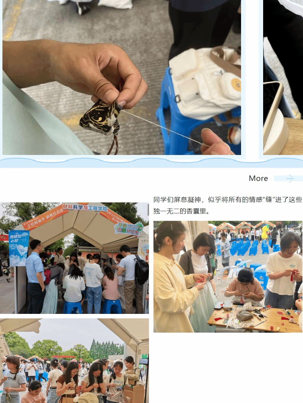 “蹙金妃子小花囊,销耗胸前结旧香。”香囊是我国传统手工艺品杰出之作,而今天,同学们自制香囊,传达这份浓郁的情感。
