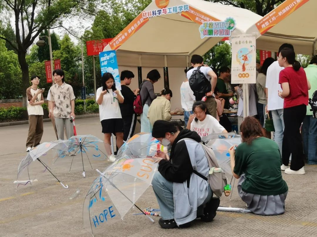 人来人往,来参加的同学们络绎不绝,聚精会神地投入到晴雨伞的创作中,现场的伞已经“供不应求”了!