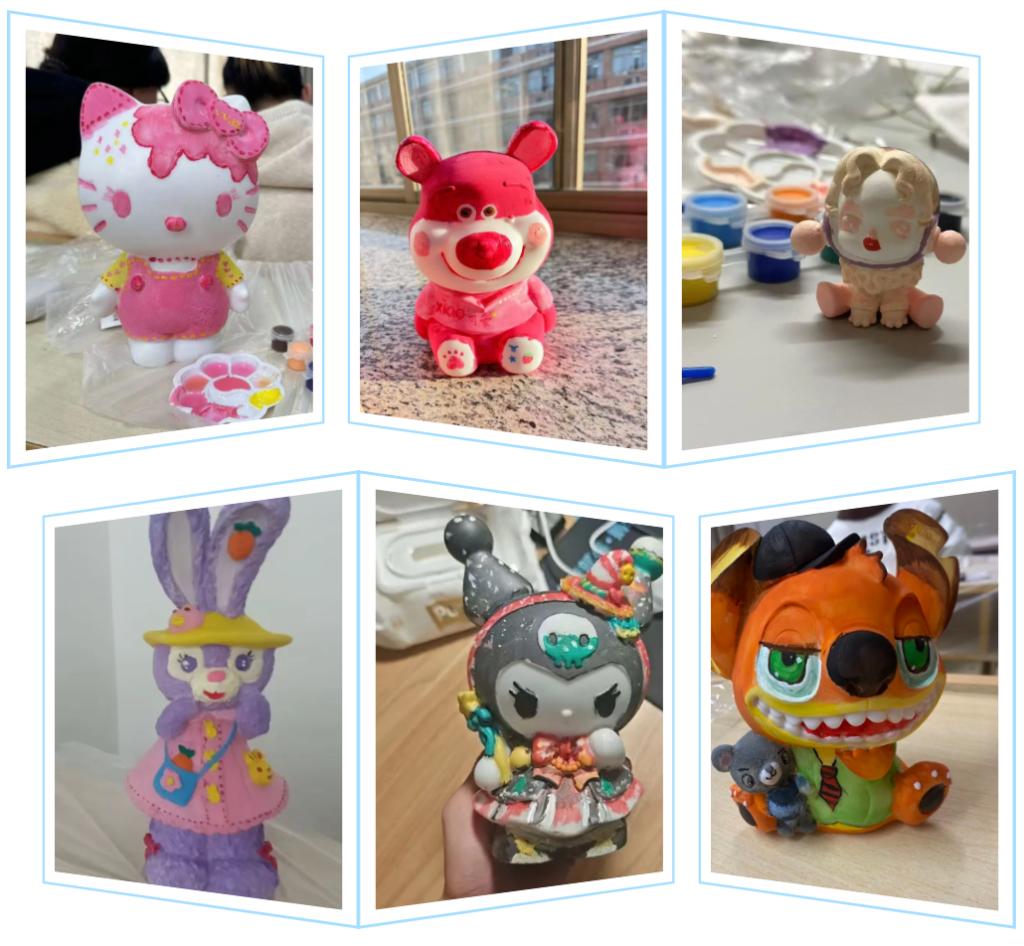 同学们自由选择了喜爱的色彩,用画笔在石膏娃娃上尽情创作,用丰富的色彩和独特的想象力,为一个个石膏娃娃赋予了鲜活的生命力。