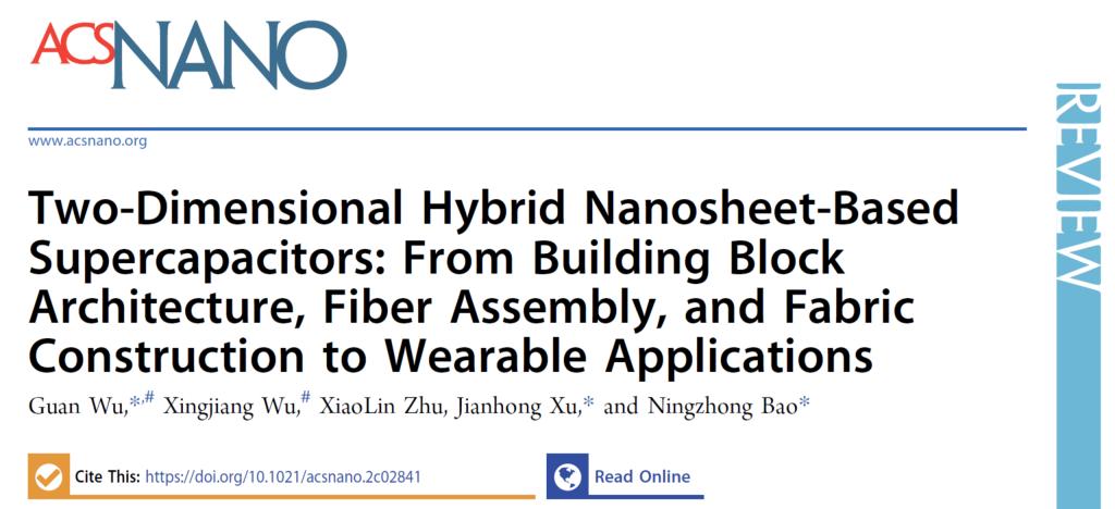 2022年7月,在ACS Nano杂志上发表了题为《Two-Dimensional Hybrid Nanosheet-Based Supercapacitors: From Building Block Architecture, Fiber Assembly, and Fabric Construction to Wearable Applications》的综述文章。围绕纤维微观基元、介观纤维到宏观织物的多尺度研究对象,从化学组装和制备出发,对二维复合材料纤维基超级电容器的最新研究进展进行了总结。系统概括了:(1) 微观二维基元设计:基于表面修饰、赝电容耦合、异质结构调控与界面共价/静电组装等,构筑的二维复合基元能够高效促进电子传导、电荷转移和离子吸附;(2) 有序介观纤维组装:基于各种纺丝方法 (湿法纺丝、干法纺丝、静电纺丝、微流控纺丝和限域组装) 制备具有各向异性、均一多孔、垂直排列、中空网络、异质结构等的有序纤维,大幅提升了纤维中的离子动力学扩散及存储能力;(3) 多功能宏观织物装配:基于微流体、气喷纺丝,3D打印技术等先进纺丝技术制备的多功能织物,具有高力学强度/柔性、大导电性和优循环寿命,同步提升了器件的机械柔性和能量密度;(4) 可穿戴实际应用:优化集成了柔性超级电容器、发电装置和电子器件,实现了穿戴供电、自供能、健康管理和续航应用。此外,作者针对纤维基超级电容器的难点与挑战,着重讨论了二维基元材料、介观纤维、宏观织物及可穿戴应用的优/缺点和未来发展方向,为高性能纤维基超级电容器可控设计、创新发展和实际应用提供了理论基础和技术参考。