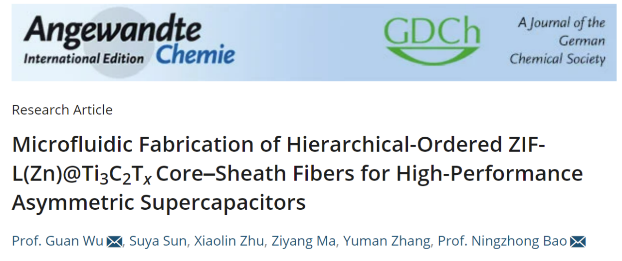 2022年2月,在Angewandte Chemie International Edition杂志上发表了题为《Microfluidic Fabrication of Hierarchical-Ordered ZIF-L(Zn)@Ti3C2Tx Core-Sheath Fibers for High-Performance Asymmetric Supercapacitors》的文章。该工作从设计纤维电极的有序微结构和多孔界面入手,开发微流控组装和限域微通道反应新方法,构建了分级有序的ZIF-L(Zn)@Ti3C2Tx芯鞘纤维材料。该芯鞘纤维通过Ti-O-Zn/Ti-F-Zn键桥连,具有各向异性结构、有序离子通道、丰富微/介孔垂直界面、高界面电子传导和可大规模制备的优点,极大地促进了电解质离子动力学迁移和插层存储。ZIF-L(Zn)@Ti3C2Tx芯鞘纤维,在1M H2SO4液态电解质中具有大容量 (1 A cm-3电流密度下容量为1700 F cm-3) 和优异的倍率性能 (150 A cm-3电流密度下容量为845 F cm-3)。再者,构筑的非对称固态电容器具有高能量密度 (19.0 mWh cm-3)、优异循环稳定性 (20000圈),实现大变形/可穿戴供电和耐高低温特性。得益于以上优异的性能,将纤维构筑成芯片式超级电容器,成功实现了自然光诱导的自供能应用设计,可为LEDs、光纤灯、电风扇和水位/地震报警设备供电。