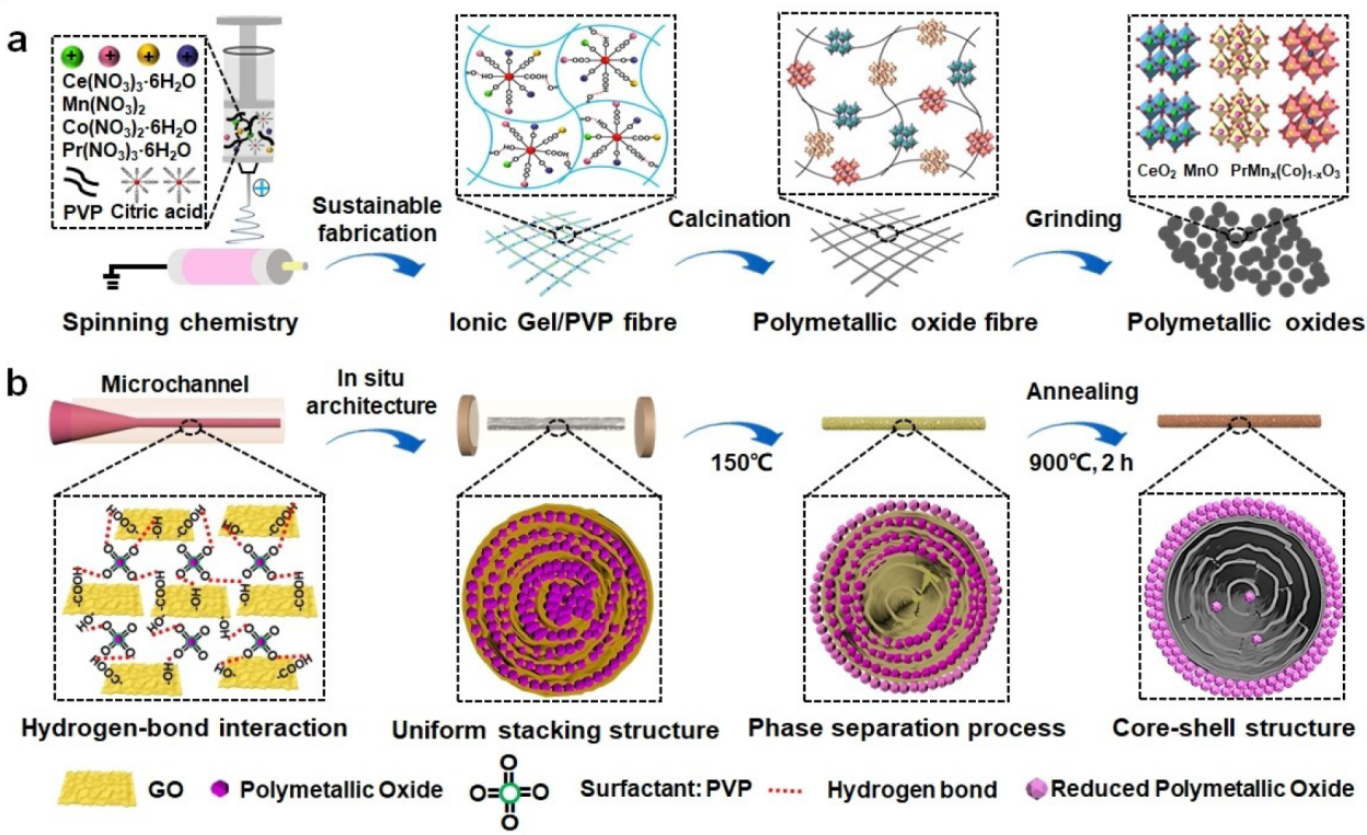 2022年6月,在Angewandte Chemie International Edition杂志上发表了题为《Interfacial Polymetallic Oxides and Hierarchical Porous Core-Shell Fibres for High Energy-Density Electrochemical Supercapacitors》的文章。该工作通过限域自组装和原位相分离策略合成异质结构多金属氧化物/多孔石墨烯微核-壳纤维(PMO-PGF)。在高温煅烧过程中,多金属氧化物通过原位相分离反应迁移并沉积到石墨烯纤维表面,同时在石墨烯纤维表面及内部形成丰富的多孔通道。PMO-PGF具有丰富的微介孔通道 (孔容:0.49 cm3 g-1, 孔径分布: 0.76-14.7 nm)、高比表面积 (432.67 m2 g-1)、大电化学活性以及优异的界面电子传导。因此,PMO-PGF在6M KOH电解质中表现出高面积比电容 (2959.78 mF cm-2) 和可控的法拉第赝电容。此外,基于PMO-PGF组装的全固态纤维状超级电容器在PVDF-HFP/EMIMBF4中呈现出超高的能量密度 (187.22 μWh cm-2)、大的面积比电容 (862.72 mF cm-2) 和长的循环稳定性 (20000次循环后电容保留95.8%)。基于以上优异的电化学储能性能,该纤维基超级电容器实现了为各种电子器件供电的实际应用。