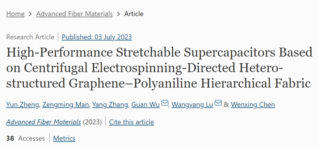 该工作通过设计离心静电纺丝化学和聚苯胺 (PANI) 诱导两步自组装方法,制备了异质结构石墨烯-聚苯胺 (G-PANI) 锚定的聚苯胺修饰聚氨酯 (pcPU) 织物电极 (G-PANI@pcPU) 材料。该电极具有相互连接的多孔骨架、开放的离子迁移/插层通道、高机械柔性 (断裂伸长率:400%) 和大规模制备 (>90 cm2) 优势。在三电极系统中,G-PANI@pcPU表现出超大的面积电容 (5093.7 mF cm-2) 与赝电容可调性能。构筑的可拉伸超级电容器 (S-SCs) 具有高能量密度 (69.2 μWh cm−2)、大比电容 (3113.7 mF cm−2) 和优异的可拉伸循环稳定性 (84.1%),并实现了在高拉伸 (100%) 形变条件下为电子器件稳定供电的应用。相关工作以“High-Performance Stretchable Supercapacitors Based on Centrifugal Electrospinning-Directed Hetero-structured Graphene–Polyaniline Hierarchical Fabric”为题发表在国产著名期刊Advanced Fiber Materials上。该论文的通讯作者是浙江理工大学材料科学与工程学院武观研究员与吕汪洋教授,第一作者为浙江理工大学博士研究生郑韵。