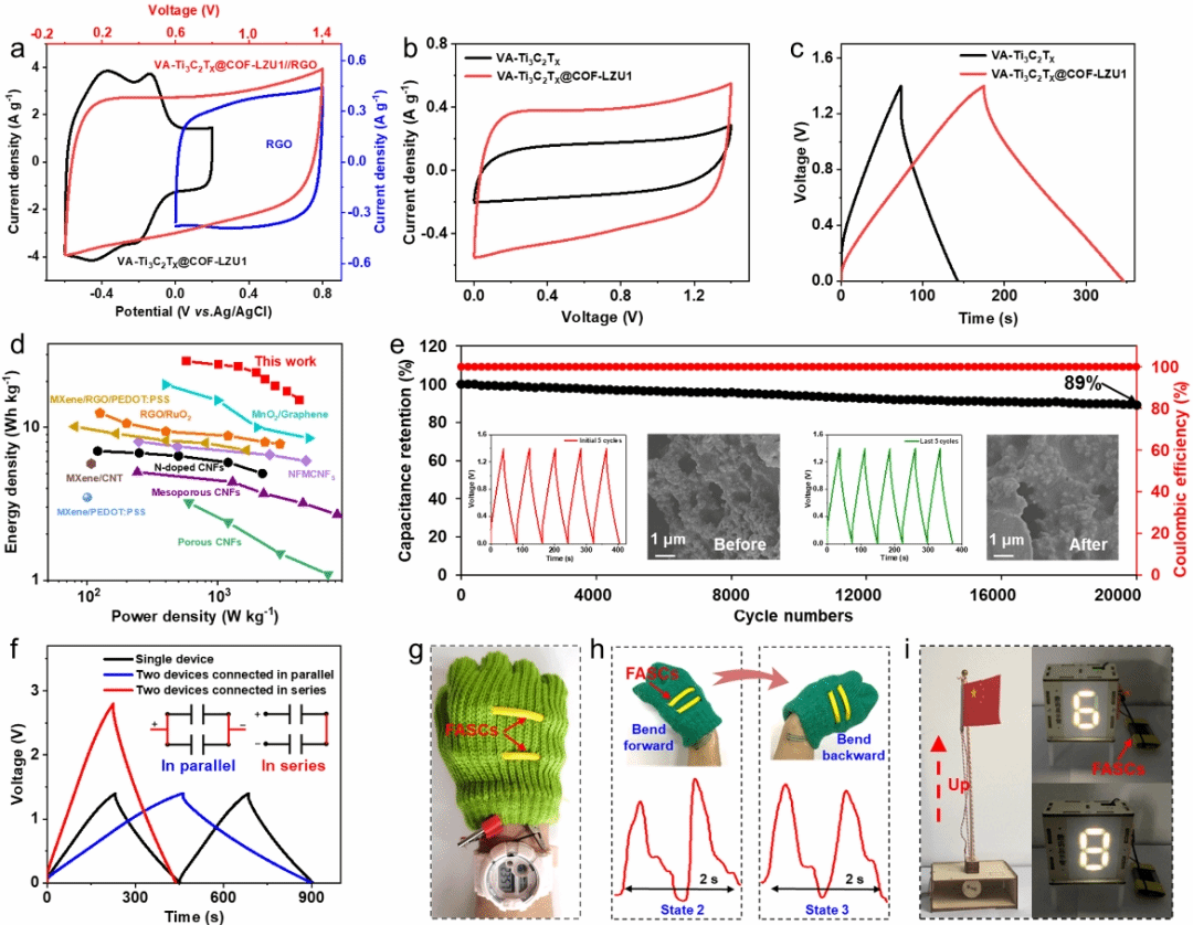 图2. VA-Ti3C2Tx@COF-LZU1纤维电化学性能对比图与储能机理图。