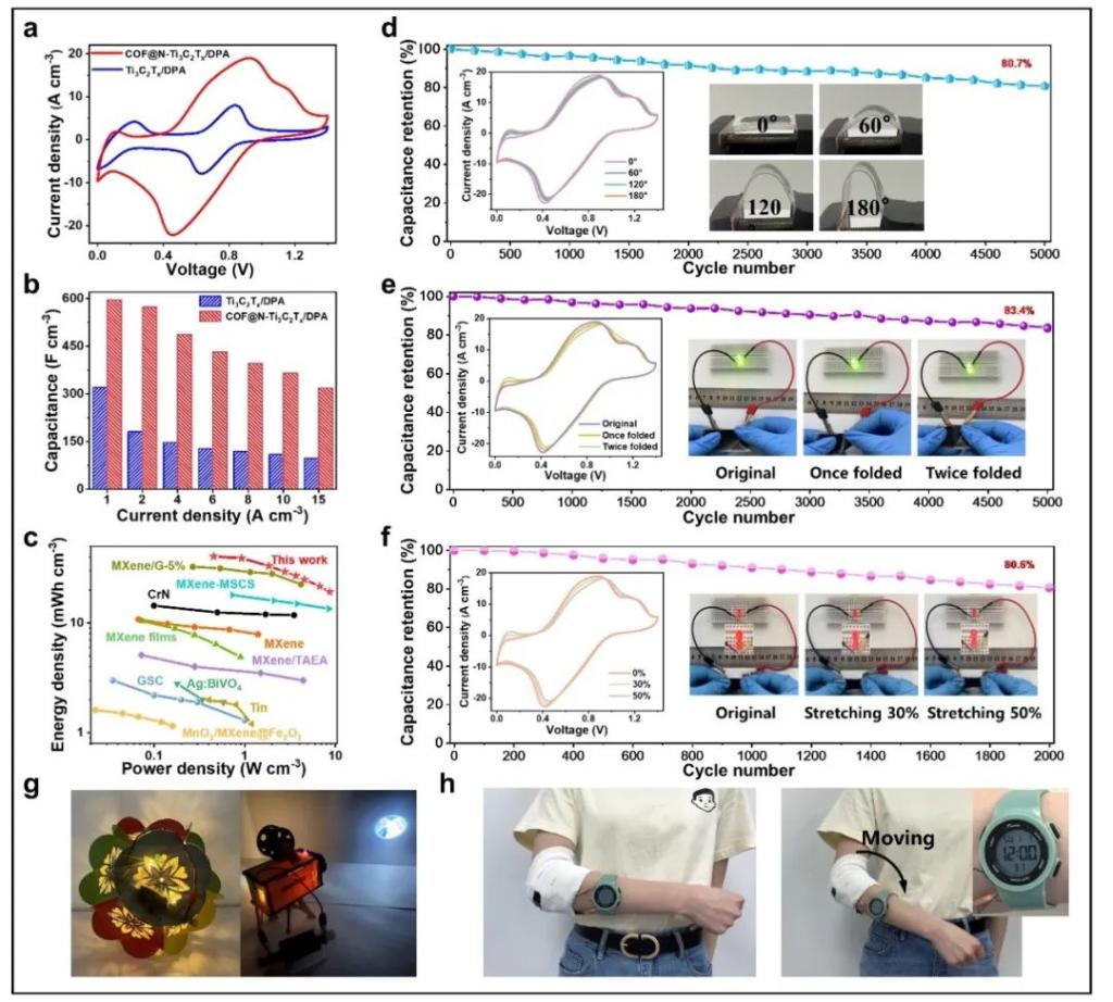 图1. COF@N-Ti3C2Tx/DPA柔性电极的设计与储能机理。