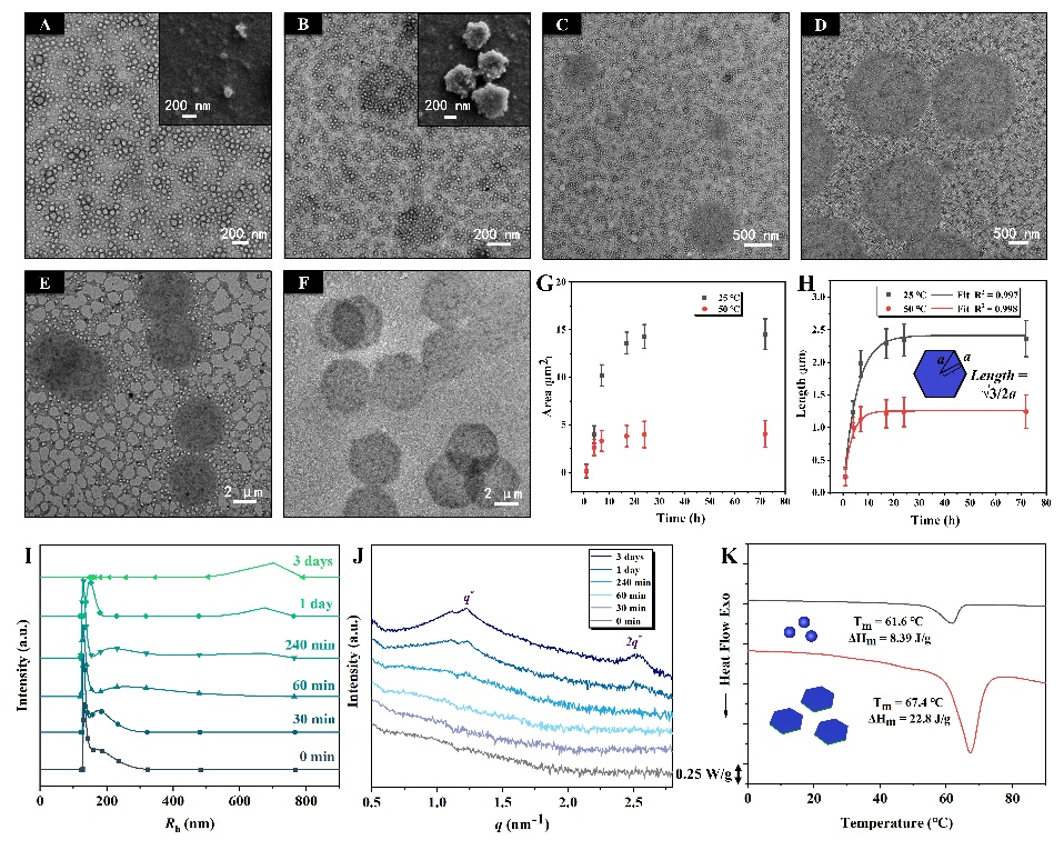 随后,作者对二维六边形片状胶束的生长机制进行了详细的分析。缓慢冷却的形貌追踪表明当体系温度下降至浊点以下,通过球状胶束融合即可快速形成晶种。据此,作者进一步研究了快速降温后等温结晶过程中二维片状胶束的生长机制(图3)。当溶液温度从65 ℃淬冷至25 ℃时(t = 0),由于疏水/亲水的胶束化作用,形成平均直径约为40 nm的无序链排列的球形纳米颗粒。这些颗粒在热力学上并不稳定,在侧链结晶的驱动下,这些初始形成的球形纳米颗粒将作为下一阶段颗粒逐步融合的基元,从而在等温结晶0.5小时后观察到小尺寸的六边形片,这些形成的小尺寸六边形片可作为球状胶束不断附着横向生长的核。因此,二维六边形片的尺寸会随着等温结晶时间的增加而增大,直到所有可用的球形纳米粒子都消耗殆尽,最终形成热力学上稳定的二维六边形片状胶束。该“粒子附着结晶”的过程可以进一步由原位DLS, SAXS检测到,同时DSC结果也进一步说明了热力学稳定的六边形片具有更高的熔融焓。最后,作者对六边形片状胶束的径向生长动力学进行拟合,结果表明该六边形胶束的生长遵循恒定溶液体系中的典型晶体生长模型。该结果表明在等温结晶过程中,体系的晶核浓度几乎是固定的。因此整个等温结晶过程中,晶体成核速度相较于晶体的侧向生长速度是比较快的,这种快速成核和缓慢的晶体生长过程最终形成了尺寸均一、分散度低的六边形片状材料。