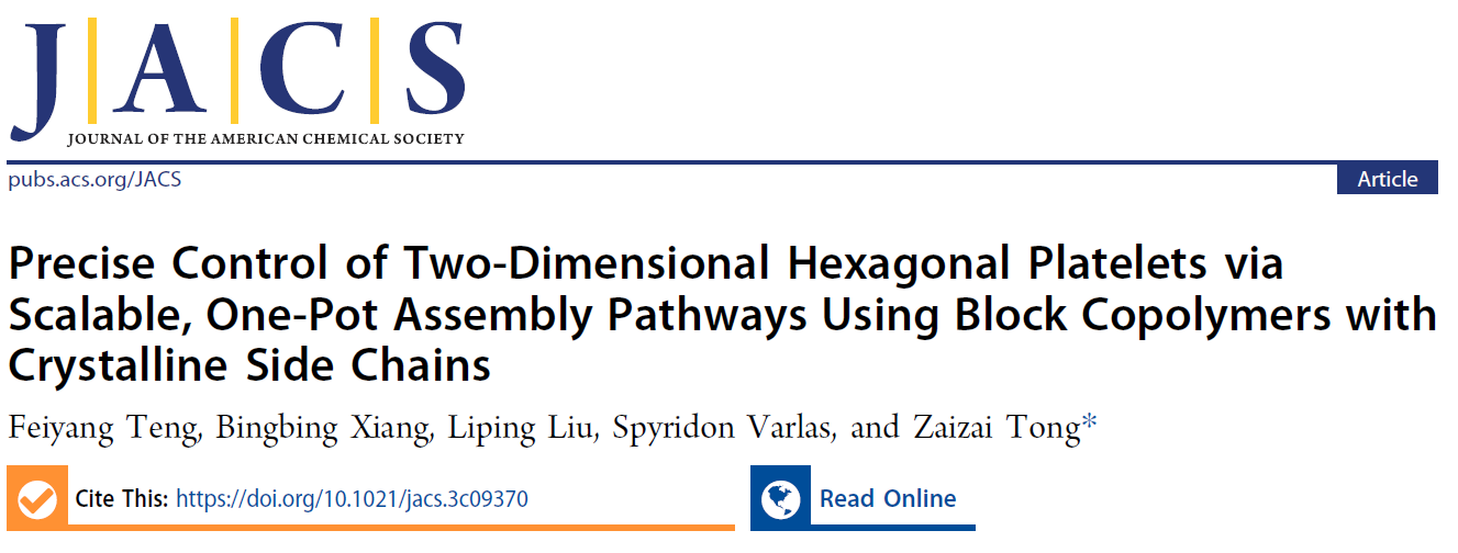 近日,材料科学与工程学院童再再团队在前期可结晶聚酯类嵌段共聚物的精确自组装研究方面取得的丰富成果基础上(Nat. Chem. 2023, 15, 824; ACS Nano 2023, 17, 24141; Macromolecules 2023, 56, 9685; Macromolecules 2023, 56, 5984; Macromolecules 2022, 55, 1067; Macromolecules 2022, 55, 8250; Macromolecules 2021, 54, 2844),又发现了一种新的结晶组装机制——“粒子附着结晶”,成果发表在国际高水平期刊《Journal of the American Chemical Society》上。材料科学与工程学院硕士生滕飞阳为第一作者,童再再副教授为通讯作者。