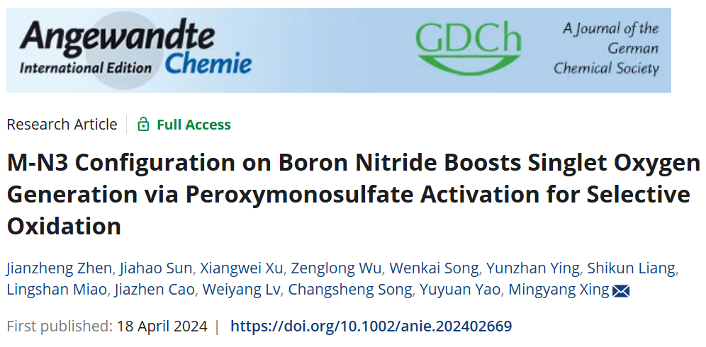近日,材料科学与工程学院青年教师吕维扬、姚玉元团队和宋昌盛团队在国际权威学术期刊《德国应用化学》(Angewandte Chemie International Edition, Angew. Chem. Int. Ed.)上,发表了题为“M-N3 configuration on boron nitride boosts singlet oxygen generation via peroxymonosulfate activation for selective oxidation”的研究论文。我院20级博士生甄建政为论文的第一作者,浙江理工大学吕维扬、宋昌盛和华东理工大学邢明阳为共同通讯作者。该研究成果得到了国家自然科学基金、浙江省自然科学基金和上海市优秀学术带头人等项目的支持。