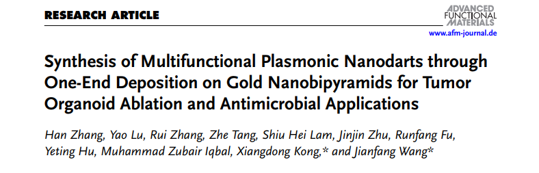 近日,浙江理工大学材料科学与工程学院孔祥东教授团队联合香港中文大学王建方教授团队合作报道了一种新型等离激元纳米材料的制备方法,即在金纳米双锥的一端选择性地沉积 AgPd 双金属,形成AgPd 纳米飞镖,从而获得飞镖状纳米结构,在近红外II区光热催化协同作用下,显示出优异的抗肿瘤及抗菌效果。相关成果发表于材料科学TOP期刊Adv. Funct. Mater.(IF=19),通讯作者为浙江理工大学材料科学与工程学院孔祥东教授与香港中文大学王建方教授。我院章瀚特聘副教授、2021级博士研究生张瑞为共同第一作者,我校为第一通讯单位。