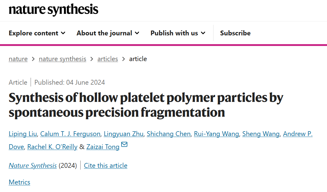 上述研究工作以“Synthesis of hollow platelet polymer particles by spontaneous precision fragmentation”为题发表在Nature Synthesis 期刊上,DOI:10.1038/s44160-024-00554-0。研究工作受到了伯明翰大学Rachel O’Reilly教授, Andrew Dove教授、Calum Ferguson博士的大力指导和帮助,同时材料科学与工程学院陈世昌副教授在聚酯合成方法上提供了大量帮助,工作还受到材料科学与工程学院王晟教授、西安交通大学王瑞洋研究员的指导。该研究工作得到了国家自然科学基金(22273087),浙江理工大学基本科研业务费专项资金(23212098-Y)和浙江理工大学优秀研究生学位论文培育基金(LW-YP2024004)的资助。