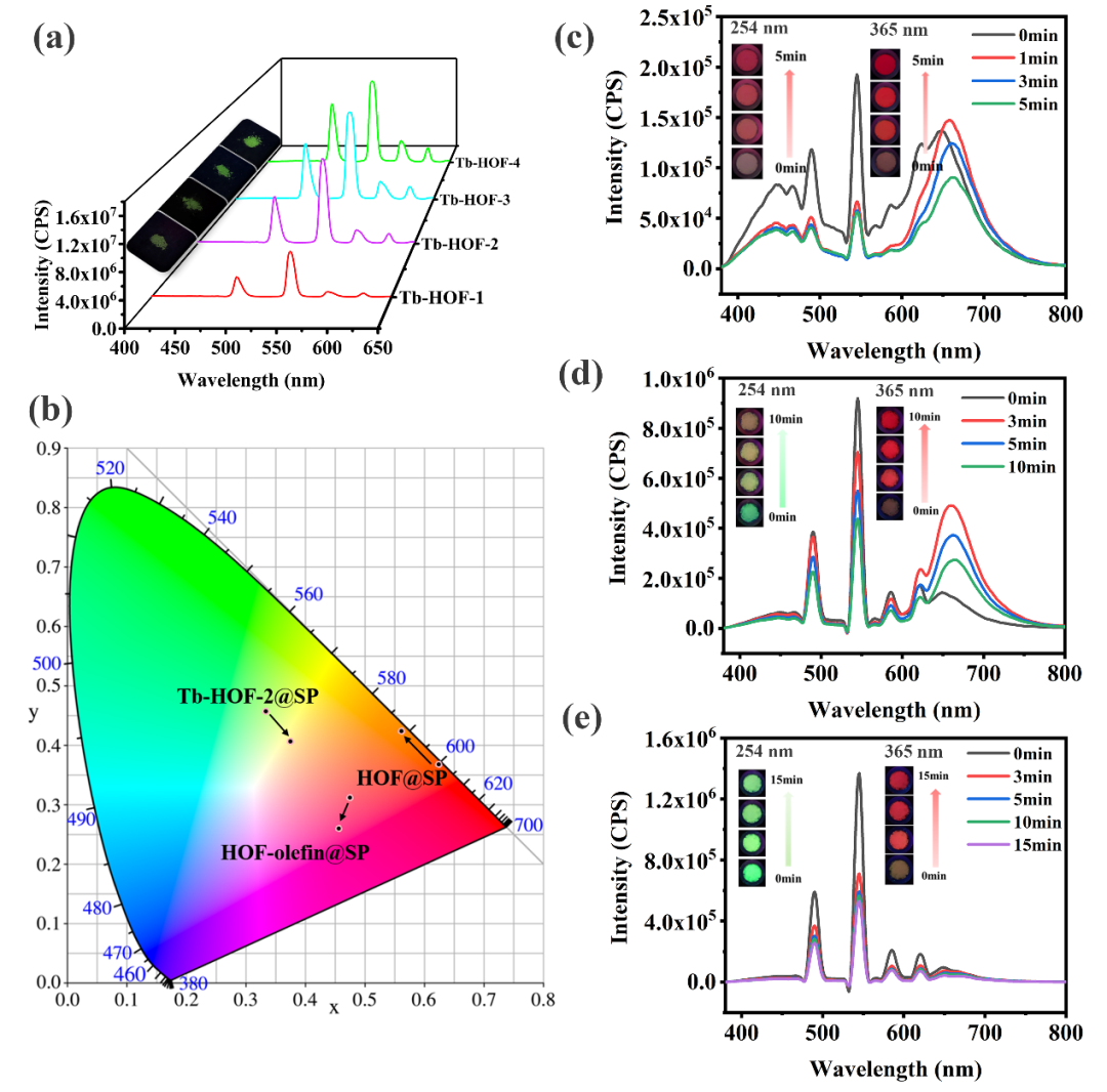 为了进一步提高信息加密等级,作者选择具有绿色荧光发射的Tb3+修饰HOFs。一方面,Tb3+的引入可以与游离的羧基络合,提高HOFs的结构稳定性。另一方面,利用Tb3+和MC之间的荧光共振能量(FRET)过程,实现不同的动态荧光发射。为了探究Tb3+含量对体系光致变色,发光性能的影响,作者制备了一系列不同Tb3+含量的Tb-HOFs,然后利用HOFs的规则孔径吸附螺吡喃分子制备Tb-HOF@SP。在荧光光谱中,在365 nm刺激下,体系都显示从黄色到红色的荧光发射。然而,在254 nm下,发射变化明显不同。Tb3+含量低时,Tb3+发射不强,FRET过程较弱,刺激前后体系荧光发射对比不明显。随着Tb3+浓度的增加,Tb-HOF-2@SP呈现出明显的由绿色变为橙色的变化。