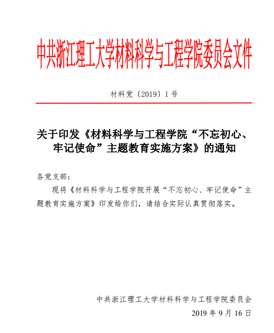 党建动态 当前位置: 首页 > 党建思政 > 党建动态 > 正文 材料党〔2019〕1号-材料科学与工程学院“不忘初心、牢记使命”主题教育实施方案 作者:时间:2019-09-17浏览次数: 附件【材料党〔2019〕1号-材料科学与工程学院“不忘初心、牢记使命”主题教育实施方案.pdf】已下载次