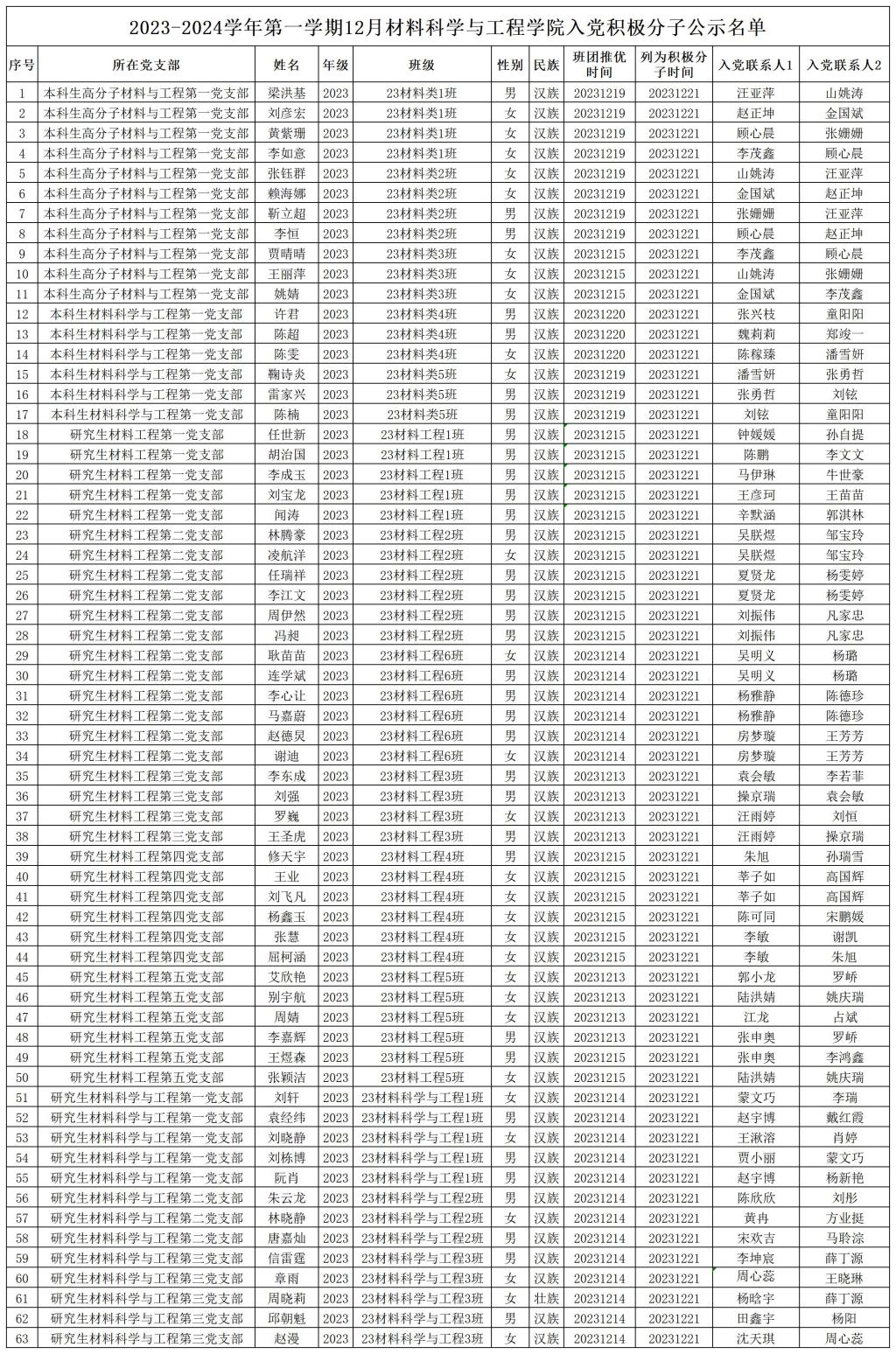 党建动态 当前位置: 首页 > 党建思政 > 党建动态 > 正文 材料科学与工程学院2023年12月入党积极分子名单公示 作者:时间:2023-12-21浏览次数: 各党支部、团支部: 经各团支部“推优”、学院团委审核以及各党支部委员会讨论研究决定,确定梁洪基等63位同志为入党积极分子,现将名单公示如下: 公示时间:12月21日—12月23日,公示期内,凡对以上同志确定为入党积极分子有意见者,请及时以口头或书面的形式向我院党委或党支部反映问题。 联系电话:86845861,联系人:鲁宏浩。 E-mail:[email protected] ;办公室地址:24-404。 材料科学与工程学院党委 2023年12月21日