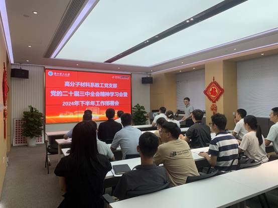 为深入传达党的二十届三中全会及浙江省委十五届五次全会精神,扎实推进各项改革任务向纵深发展,切实将会议精神转化为推动浙江高质量发展的强大动力,高分子材料党支部于8月24日下午在24号楼415报告厅召开党委理论学习会议。