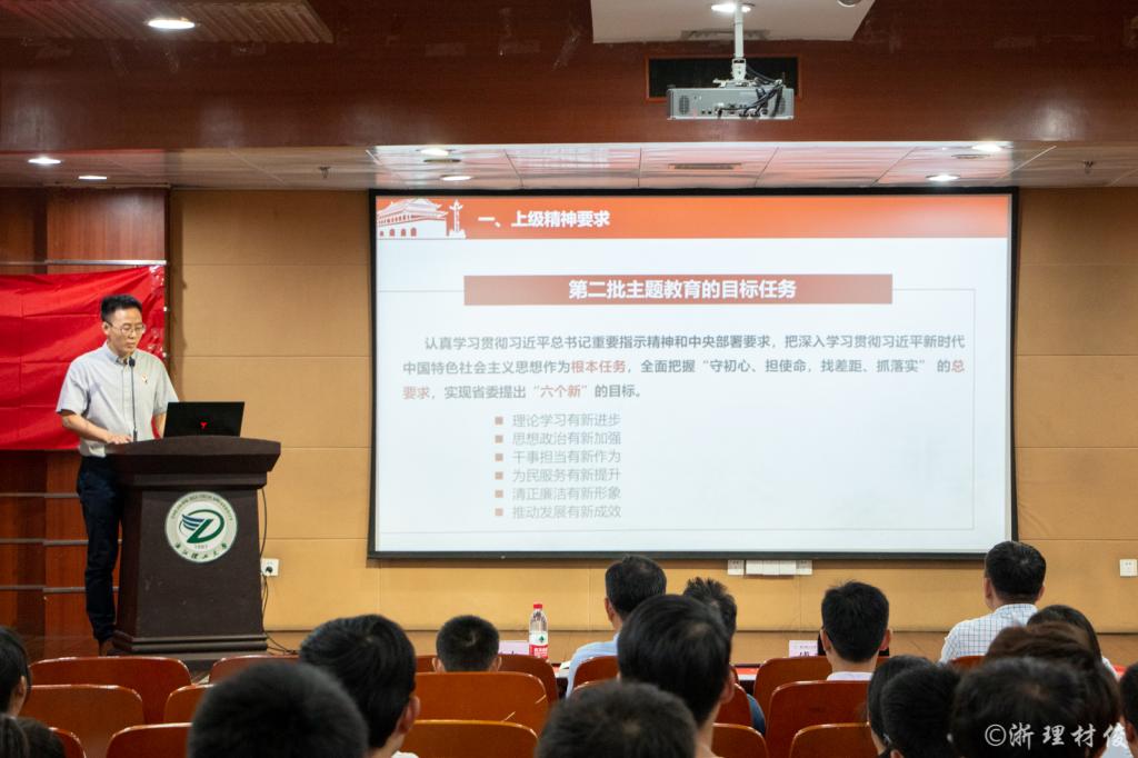 会议伊始,来自国旗护卫队的我院同学护送国旗入场并手持国旗,全场奏唱国歌。随后,周照东老师代表学院党委进行主题教育工作布置,从开展主题教育的重大意义、主题教育的目标任务、总体安排和具体工作、工作要求四个方面进行工作部署。强调要确保主题教育每个环节都要做到实效,着实开展“初心、使命、担当”为主题的学习教育,重点指出问题检视需要通过多种方式深入基层广泛的征求意见建议,以及认真对标检视反思。并要求全体党员同志要将学习教育、调查研究、检视问题、整改落实贯穿全过程。