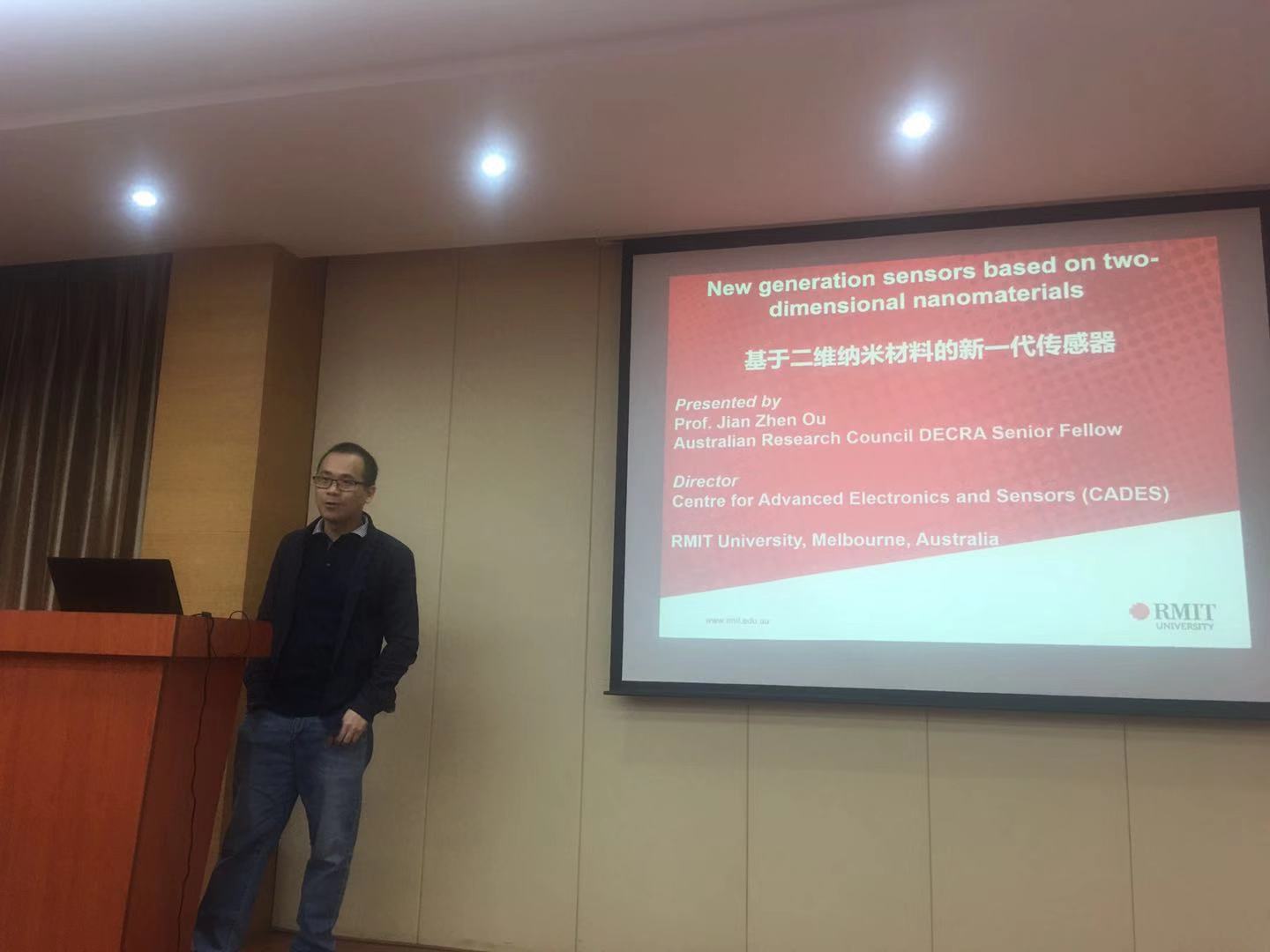 近日,澳大利亚皇家墨尔本理工大学先进电子与传感器研究中心主任欧建臻教授及其课题组的王宜超博士、Enmal Haque博士应邀到糖心vlog开展学术交流,并为糖心vlog师生作了精彩的学术报告。学者们介绍了欧建臻教授课题组近年在二维纳米材料的研究进展,内容涵盖了基于LED光电探测器的等离子体传感器、pH传感的集成硅光子传感器、癌细胞检测的拉曼-微流控芯片和肠病和疾病诊断的人体气体传感胶囊等方面新发展。报告会后,与会师生与欧建臻教授、王宜超博士及Enmal Haque博士进行了深入交流,气氛活跃。
