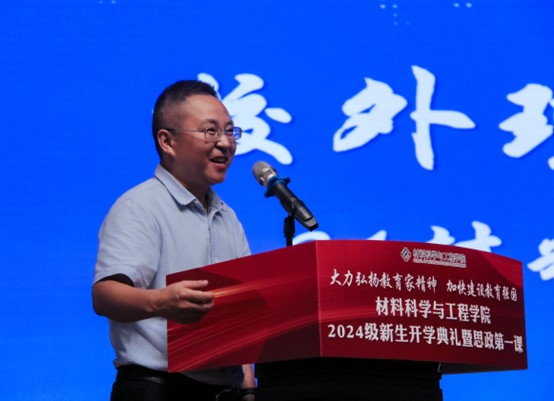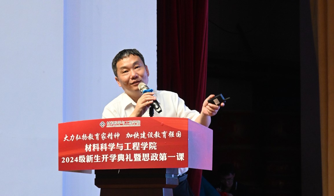 学院院长张先明教授给全体同学上“开学思政第一课”。他围绕“学院发展:朝气蓬勃、特色鲜明”“走进材料:发展基础、引领未来”“大学期望:志存高远、勇攀高峰”三大主题,向新生们详实介绍了学院历史、材料学科发展与学院人才培养体系。他鼓励新生们要志存高远,勇于探索,将学术研究与社会实践相结合,未来能成为具有全球视野、社会责任感和创新能力的新一代材料事业接班人。