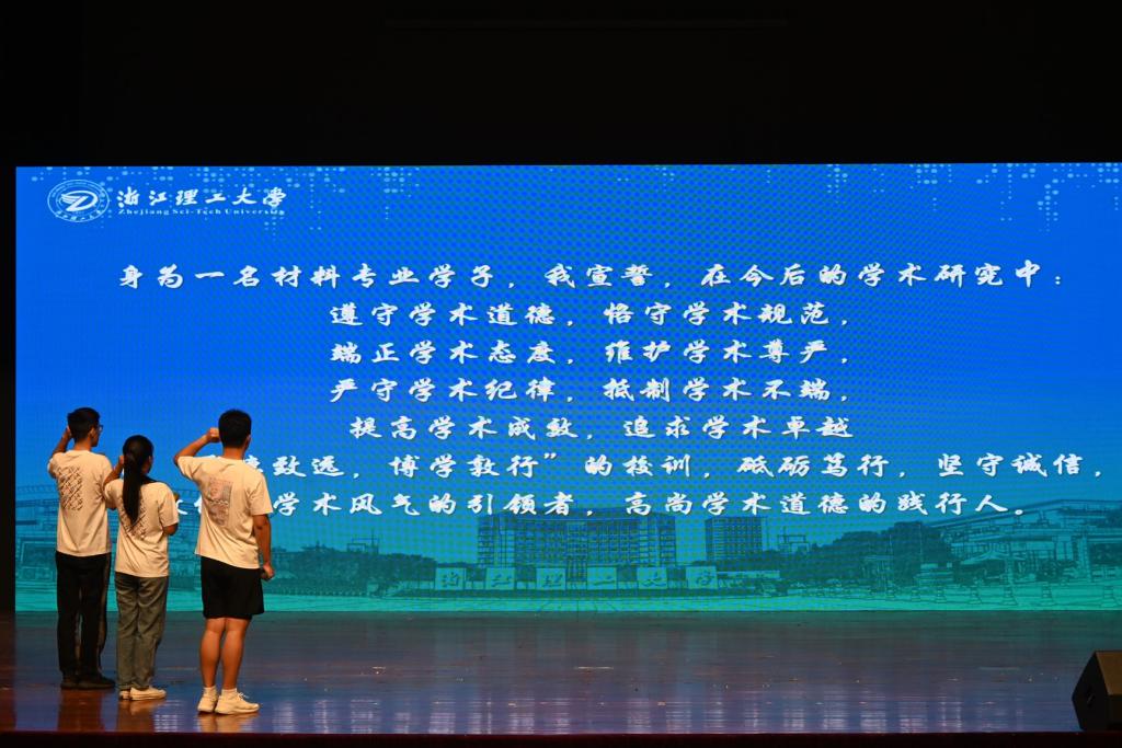 2024级本科生代表许长明、硕士研究生代表李书勤、博士研究生代表邓烨丰围绕《浙理有“料”,国之大“材”》作主题发言,三人分别从自身的成长经历出发,激情宣誓,立志投身材料强国事业,一起从浙理走向世界!