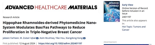 孔祥东教授团队在《Advanced Healthcare Materials》(影响因子18.5)以通讯作者在线发表题为《Hippophae Rhamnoides-derived Phytomedicine Nano-System Modulates Bax/Fas Pathways to Reduce Proliferation in Triple-Negative Breast Cancer》研究性论文。该成果第一作者为糖心vlog