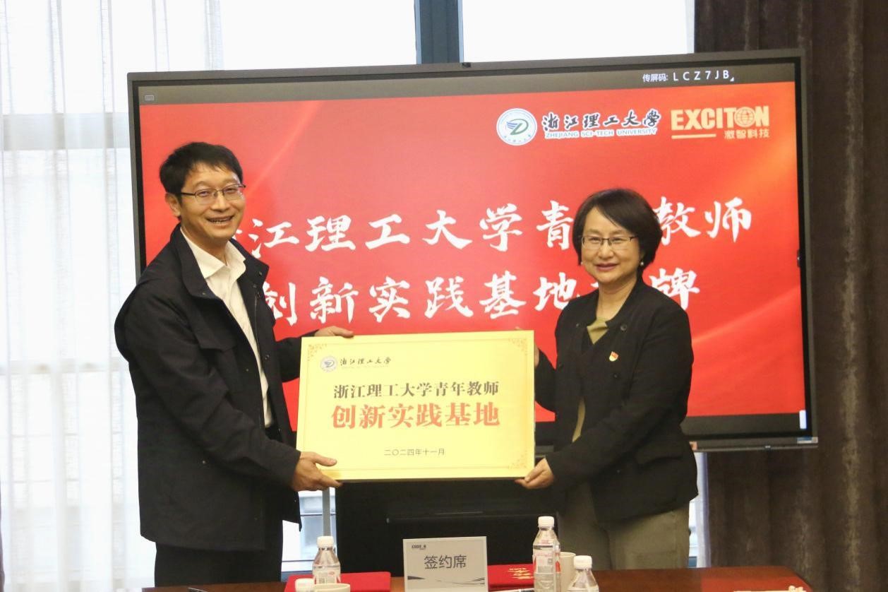 座谈现场举行浙江理工大学青年教师创新实践基地、浙江理工大学大学生实践实习基地授牌仪式,校党委副书记姚珺向宁波激智科技股份有限公司运营副总胡金福授牌。