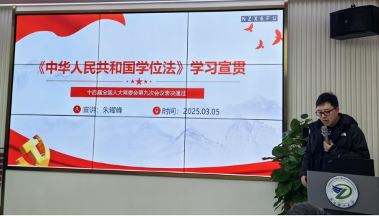 会上,副院长朱曜峰从学位授予标准、学术诚信规范、学位争议处理三大维度详细解读了《学位法》。他强调:导师们要深入理解法律精神,在日常教学和指导工作中严格按照法规要求执行;学院也将进一步完善教学管理制度,建立相应的监督与反馈机制,确保《学位法》在学院研究生培养工作中得到有效落实。