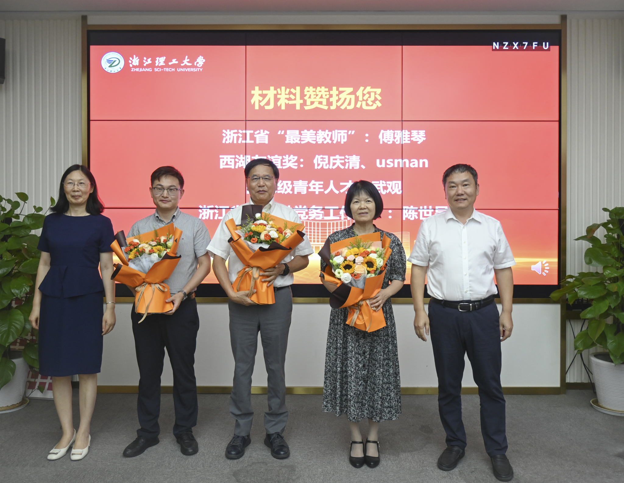 在“材料赞扬您”表彰环节,学院对2025年度在党务工作、教育教学、科研创新等方面取得突出成绩的教师代表予以表彰。仰滢、张先明为获奖教师代表献花,感谢他们为学院发展作出的卓越贡献。
