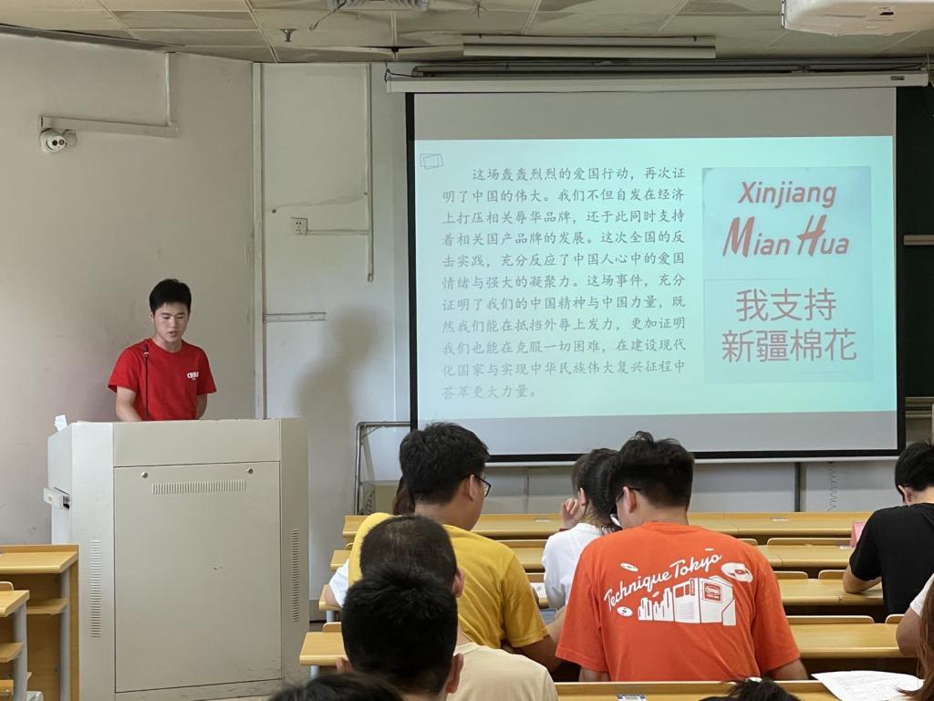 B1组的何晖宇同学以清晰的思路展示了西方诋毁新疆棉花的强盗逻辑;B2组的雷育松同学对中国空间站发射成功这一事件进行了深入解析;B3组陈义龙同学以时间为线索为我们串联了新疆棉花抹黑事件前因后果;B4组的陈稼臻同学以慷慨激昂的语调讲述了从五四运动到共产党建立这段“觉醒年代”波澜壮阔的革命历史。