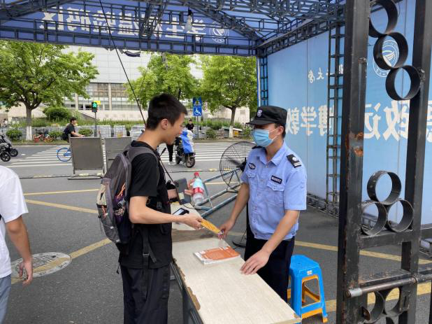 然而有那么一群人始终坚守在这条路上,那就是学校的保安们。他们不仅要维持秩序,疏通通道,还要为每一个没有走校内通道的同学们检测体温。路过的同学们经常能看到他们因为长时间举着手的疲惫。