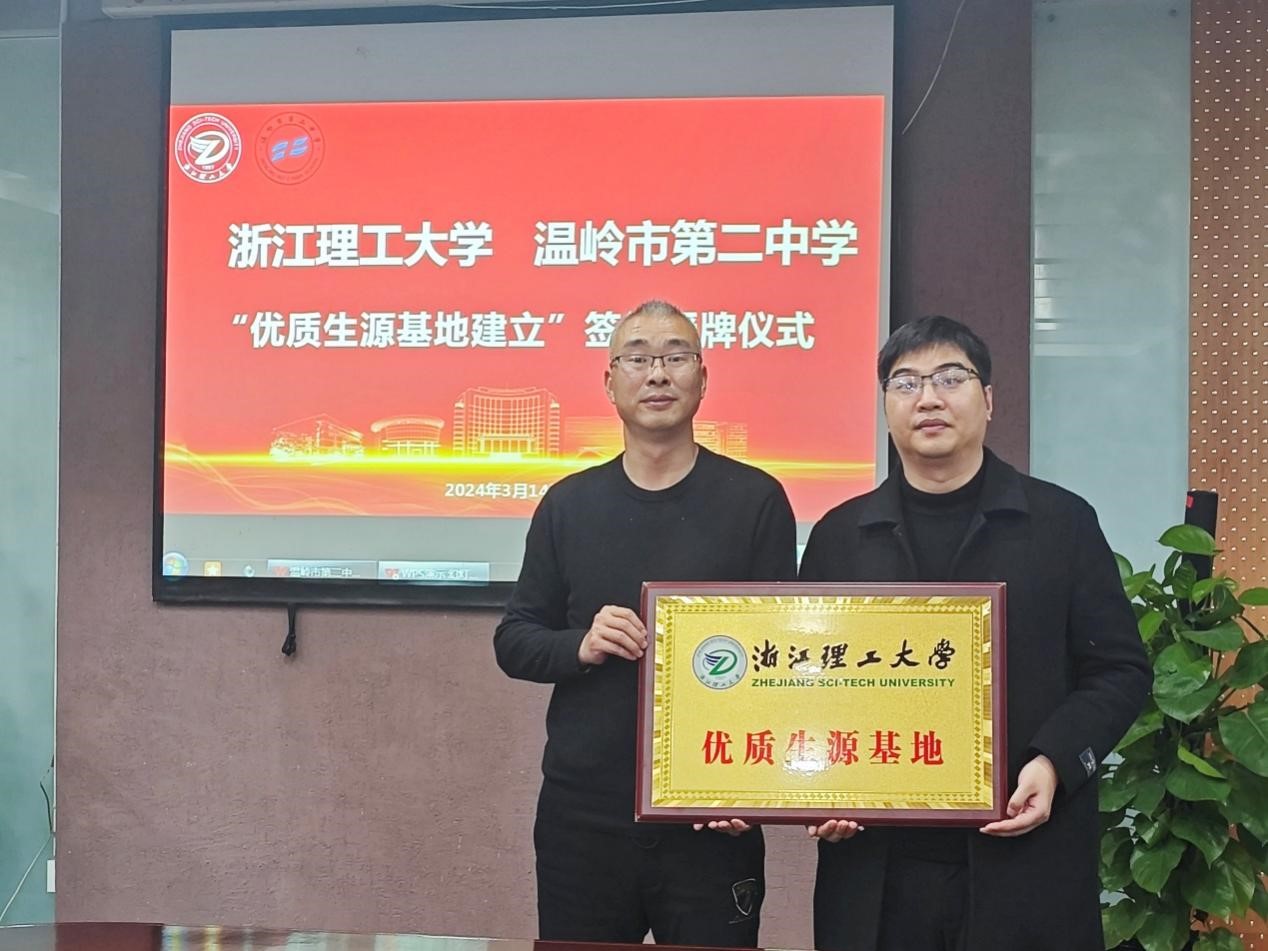 黄君代表学校授予温岭市第二中学“浙江理工大学优质生源基地”称号,陈招才代表温岭市第二中学接牌。