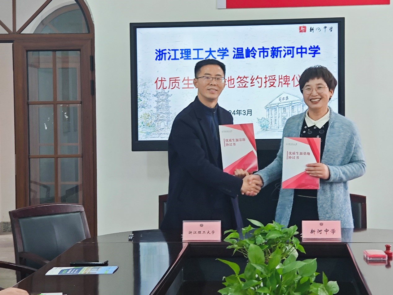 黄君代表学校授予新河中学“浙江理工大学优质生源基地”称号,林霞代表新河中学接牌。