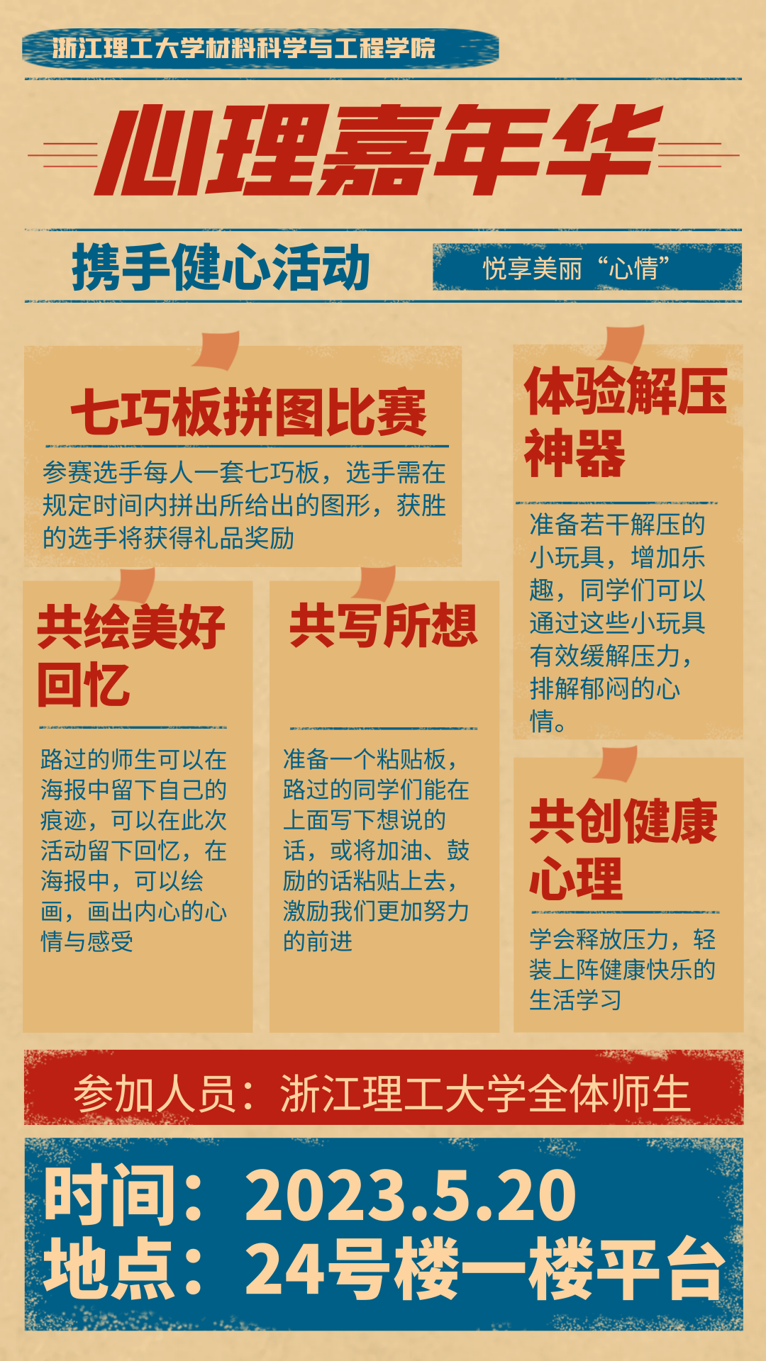 为进一步加强我院心理健康教育工作,培养学生自尊自信、理性平和、积极向上的心理品质,促进学生阳光成长,在校园中营造关爱自我、重视心理健康的良好氛围,培养学生阳光心态,在心理健康月来临之际通过各种活动形式引导学生感受生活的乐趣,树立积极向上的生活态度,减轻大家的压力,材料科学与工程学院心联将于5月20日在24号楼开展心理嘉年华活动。