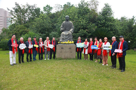 校友们漫步在校园并在图书馆前合影,一起庆祝浙江理工大学办学127周年。他们来到学校的创立者、杭州知府林启先生的雕像前合影,留下共同的纪念。