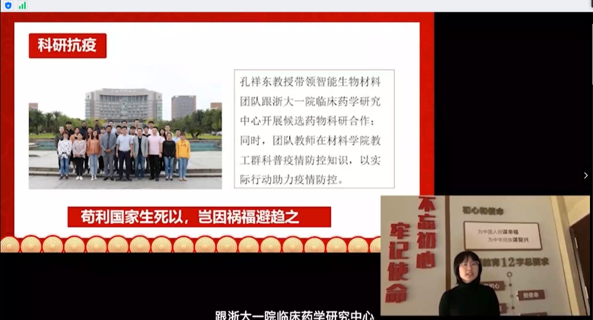 在全体团员共唱团歌后,九位同学们分别围绕疫情、志愿、中国梦等主题在线授课,随后学院辅导员团队为我们带来了疫情期间材料人的战疫担当,团员骨干们备受鼓舞。最后周照东老师作总结讲话,“一个感受,两声感谢,三个希望”,向学院团员青年们表达了全体同学疫情期间落实学院学校的管理的感谢和对提高思想站位、提高自身抗压性、青年人担当时代使命的殷切希望。