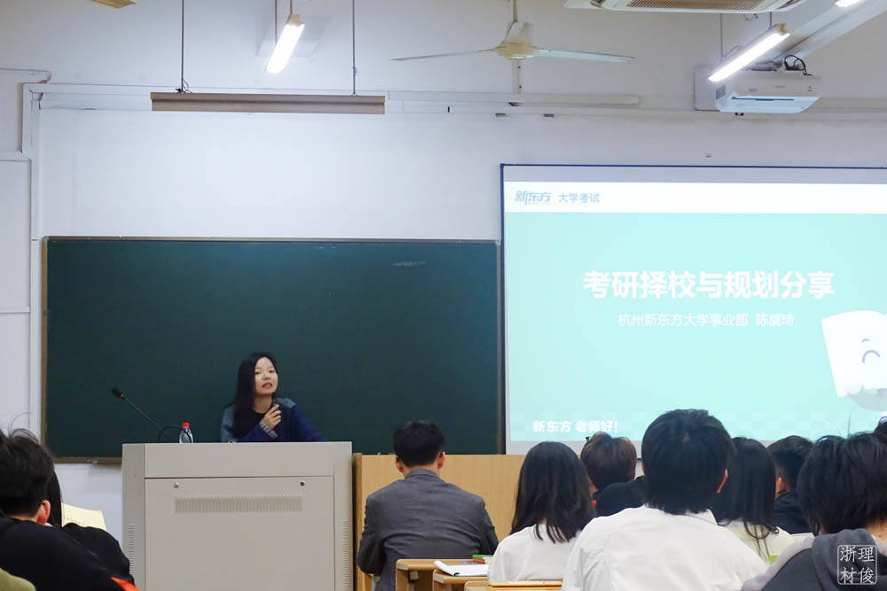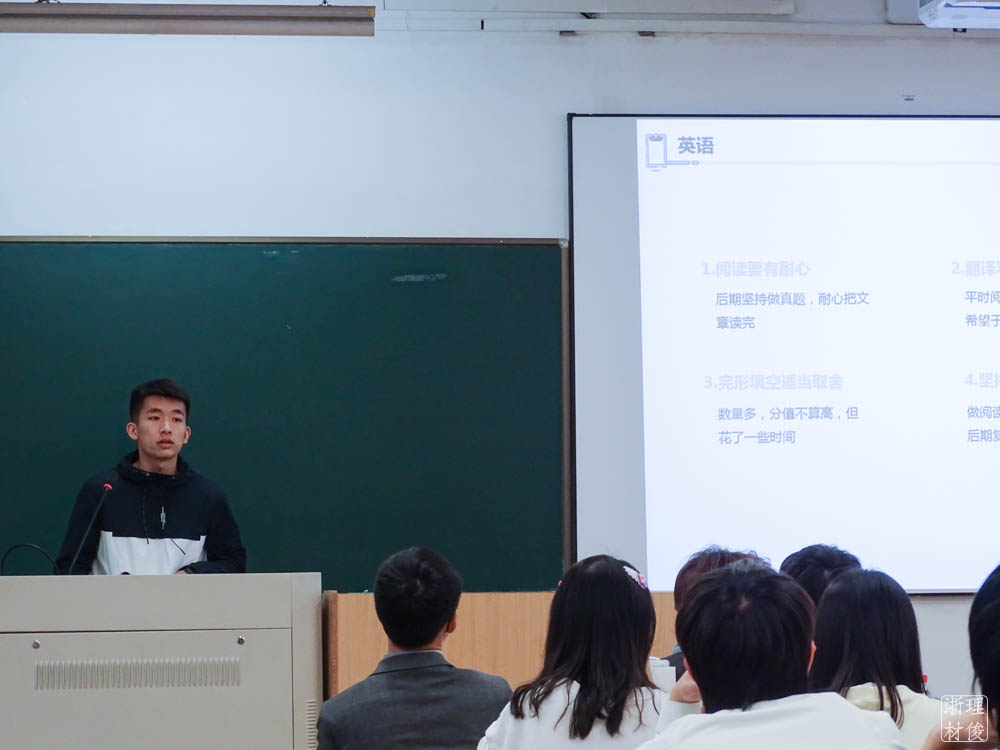会上,学院还聘请了2017级考研优秀生为“考研小导师”,以小小的平台,为2018级考研同学们的“研途”护航。同时, 党员“1+1”结对帮扶暨考研护航正式启动,学院拟聘请研究生党员为2018级考研学子进行“1+1”结对,为大家提供指导与服务,并且督促鼓舞引导每一位考研材俊, “考研过程中你不是一个人在战斗”,研究生党员代表章睿同学进行发言,章睿表示,作为一个过来人,自己也回忆起考研充实难忘的经历,希望能给大家的考研之路出一份力。最后,新东方进行了一场公益讲座,由杭州新东方大学事业部考研英语老师为大家带来考研择校与规划分享。