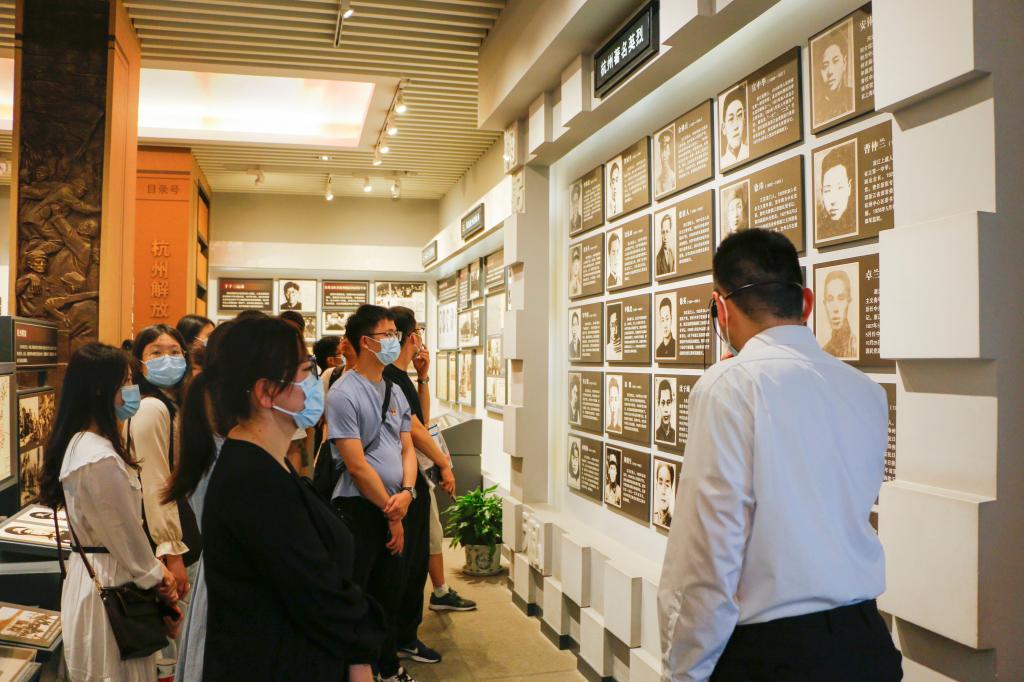 在中国共产党杭州历史馆宣誓墙前,学院组织员魏厚钱以“为什么大地春常在—致敬党史上的每一位英雄烈士”为主题进行党史课的分享,从《英雄儿女》中的王成,到《我和我的祖国》里的“前夜”,与大家分享了为新中国献身的广大英烈的故事。“为什么大地春常在?为什么战旗美如画?”正是一代代先辈的前赴后继,才有了我们现在衣食无忧,昌盛强大的祖国。最后,魏厚钱老师为学员们讲述了小萝卜头的故事:一个从小在监狱长大的男孩,通过定期的学习“特权”,以特殊的方法为中共传递重要情报,在8岁时被国民党残酷杀害,他却成为了中国历史上年龄最小的烈士,启发在场党员们要懂得感恩,“吃水不忘挖井人”,认真思考在今后的学习生活中能做些什么?