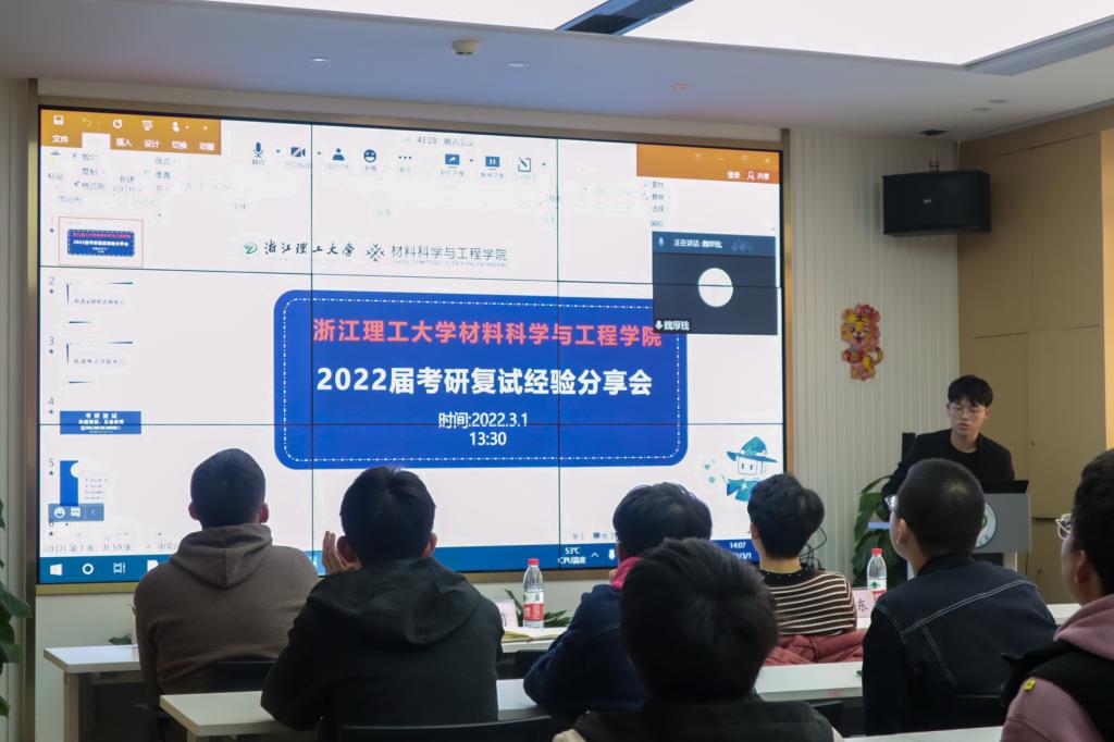 为了帮助2022届考研学子更好地准备复试,助力材料学子成功上岸。 3月1日下午,材料学院在24号楼415报告厅举办2022届考研复试经验分享会。此次分享会出席的嘉宾有学院党委副书记周照东老师、综合办主任魏莉莉老师、王騊老师、吴铭榜老师、学院本科生辅导员魏厚钱、张兴枝老师。会议邀请了目前就读于东华大学的刘洋、苏州大学的冯硕、浙江理工大学的黄洁、南京理工大学的黄齐、武汉理工大学的黄均贤、福州大学的唐海跃等六位2021届优秀校友进行线上线下经验分享,2022届40余名考研学子共同参加。