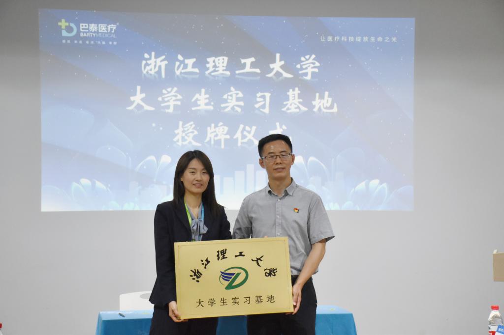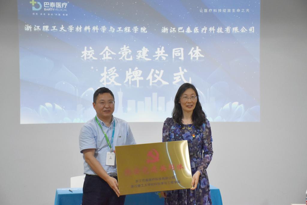 材料工程系教工党支部书记张权与巴泰医疗党支部书记饶帅辉签订《校企党建共同体合作协议》。学院党委书记仰滢与巴泰医疗总经理杜瑞林共同为校企党建共同体揭牌。学院党委副书记周照东与巴泰公司人力资源总监俞秋一共同为大学生实习基地揭牌。