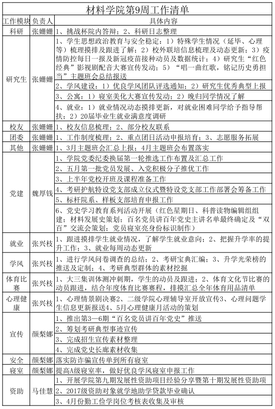 1.研究生日常工作。要及时摸排跟进特殊学生情况(延毕、心理等);做好校外联培信息梳理及动态更新;继续完成疫情防控每日一报及新冠疫苗接种动员及数据统计;进行研究生“红色经典”影视剧配音大赛宣传发动工作;完成“唱一曲红歌,铭记历史勇担当”主题班会总结报送等。