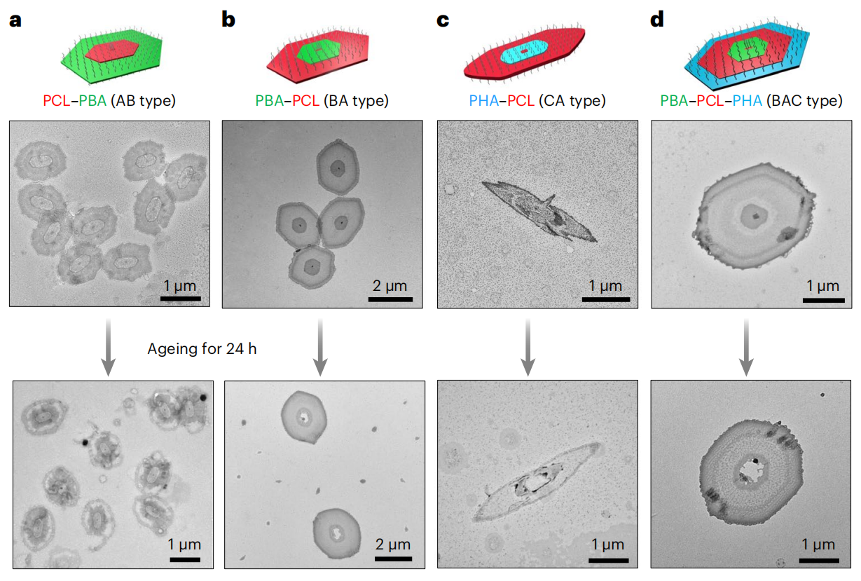 图2: 含低分子量均聚物的PCL片状胶束在-25 °C老化7天的形貌结构演化图
