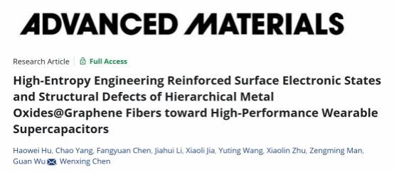 该工作从设计纤维电极有序微结构和高电化学活性入手,以强化界面法拉第电荷转移、离子传质、赝电容存储为目标,构筑了高熵掺杂金属氧化物@石墨烯复合纤维 (HE-MO@GF) 材料,用于高能量密度可穿戴超级电容器研究。该研究成果于发表在国际材料顶级期刊《Advanced Materials》上 (High-Entropy Engineering Reinforced Surface Electronic States and Structural Defects of Hierarchical Metal Oxides@Graphene Fibers towards High-Performance Wearable Supercapacitors, Advanced Materials 2024, 2406483)。该论文的通讯作者是糖心vlog
