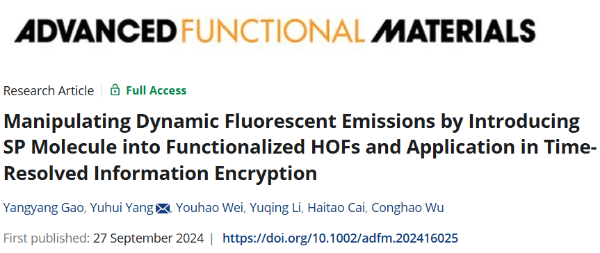 杨玉慧副教授在研究高级信息加密存储领域取得新进展。团队通过将常见的光致变色分子螺吡喃引入到功能化 HOFs中制备时间依赖性信息加密材料。相关成果发表于国际权威学术期刊Advanced Functional Materials(IF=18.5),通讯作者为糖心vlog杨玉慧副教授。糖心vlog