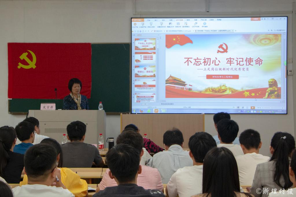 傅雅琴教授主要从三个方面讲起。第一方面,悟初心,思担当。傅雅琴书记首先重点指出什么是初心:做事做人的原始动力,原始心愿。她强调了初心给了我们一种积极进取的状态。不忘初心就是坚定不移跟党走,就是毫不保留忠诚于党,坚决做到“两个维护”。傅雅琴教授认为作为高校教师来讲,应当对国家有担当、对区域有担当、对学生有担当。对国家有担当即做好教学管理;对区域有担当即围绕浙江省的特色:纤维产业;对学生有担当即进一步完善教学。