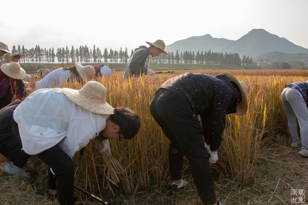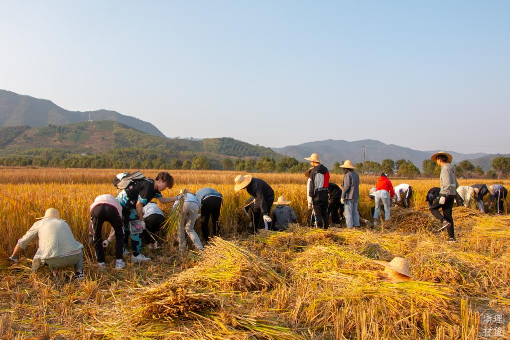 授牌仪式后,在秋高气爽、阳光明媚的午后,学院师生一行在农场总经理周哲昊及相关人员的接待下,共同参观了义远有机农场飞鸟芳原。正值花期,芳原内开遍了鲜艳的花朵,随着脚步向前,大家领略见识到了不同的香草,品嗅到了不一样的芬芳。迈入有机蔬菜棚,西红柿、胡萝卜、玉米,各种农作物应有尽有,因采用有机种植方式,菜棚内的蔬菜全部是无污染、纯天然的原生态作物。走出蔬菜大棚,大家乘坐观览车,视野转到了水稻田。如果说先前的各种参观是为了增长见识的话,那么,接下来的活动便是让学员们亲身加入实践环节之中。全体学员分成4个小组,分发镰刀、草帽、手套等相关工具之后,在各自实践稻田开始了劳动大比拼——割稻子,打稻谷。即使大部分同学并没有接触过水稻收割与脱粒这一项农活,但是同学们的劳动热情却非常高涨,大家比学赶帮,团结协作,挥舞着镰刀,挥洒着汗水,在欢声笑语中撸起袖子加油干。通过此次实践活动的开展,“博材班”学员们收获颇丰。大家在劳动实践之余,既增进了感情和团队协作能力,培养了集体观念,同时也锻炼了自己的劳动能力和实践能力。同学们充分体会到了“谁知盘中餐,粒粒皆辛苦”的朴素道理,切实感受到了“团结就是力量”的团队协作的重要性;深刻体会到了“绿水青山就是金山银山”的生态文明发展理念。