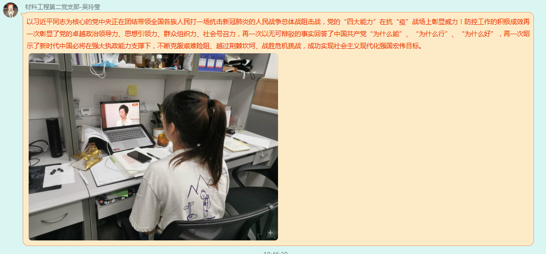 最后,在场党员一同收看了教育部抗“疫”主题节目:《高校党组织战“疫”示范微党课》,中国人民大学、复旦大学、西安交通大学、北京科技大学等高校进行分享。此外,各支部党员自行收看了省委组织部、浙江广播电视集团联合制作的“七一”党建特别节目《战疫·榜样在身边》。