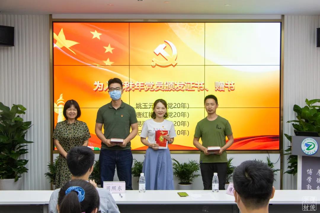 紧接着学院党委书记傅雅琴老师为入党20年的姚玉元、唐红艳、易丽丽、入党10年的纪律律老师颁发政治生日贺卡,并赠书《中国精神读本》。