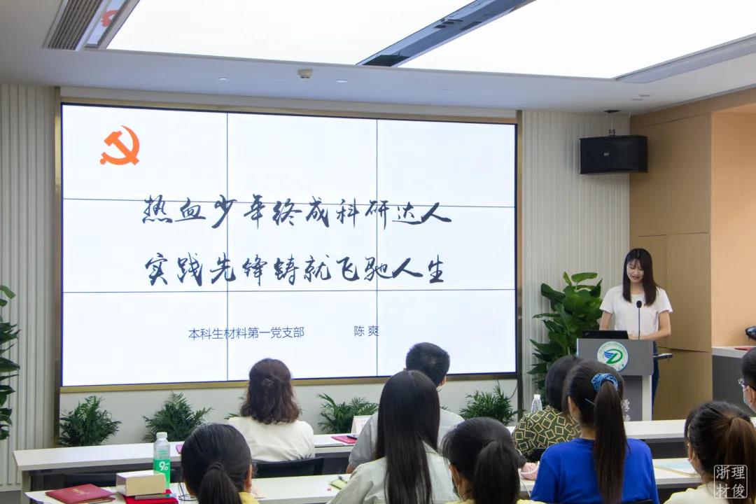 优秀学生党员代表陈爽同学上台发言,她说道:“在求真学问,练真本领的同时也要立鸿端志,做到知行合一,争做一名有担当、有作为、有品质、有修养的大学生。”